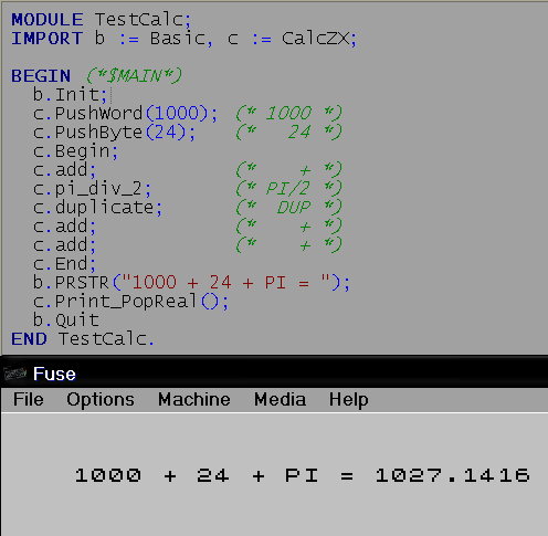 Такая идея. Когда для вещественных вычислений не так важно быстродействие, как объём занимаемой памяти, можно разработать модуль ZXRomCalc, который предоставит доступ к подпрограммам вещественного калькулятора Спектрума (RST #28) вместо более быстрой, но менее точной и менее компактной реализации вещественных вычислений SDCC. Выглядеть это может, например, так: